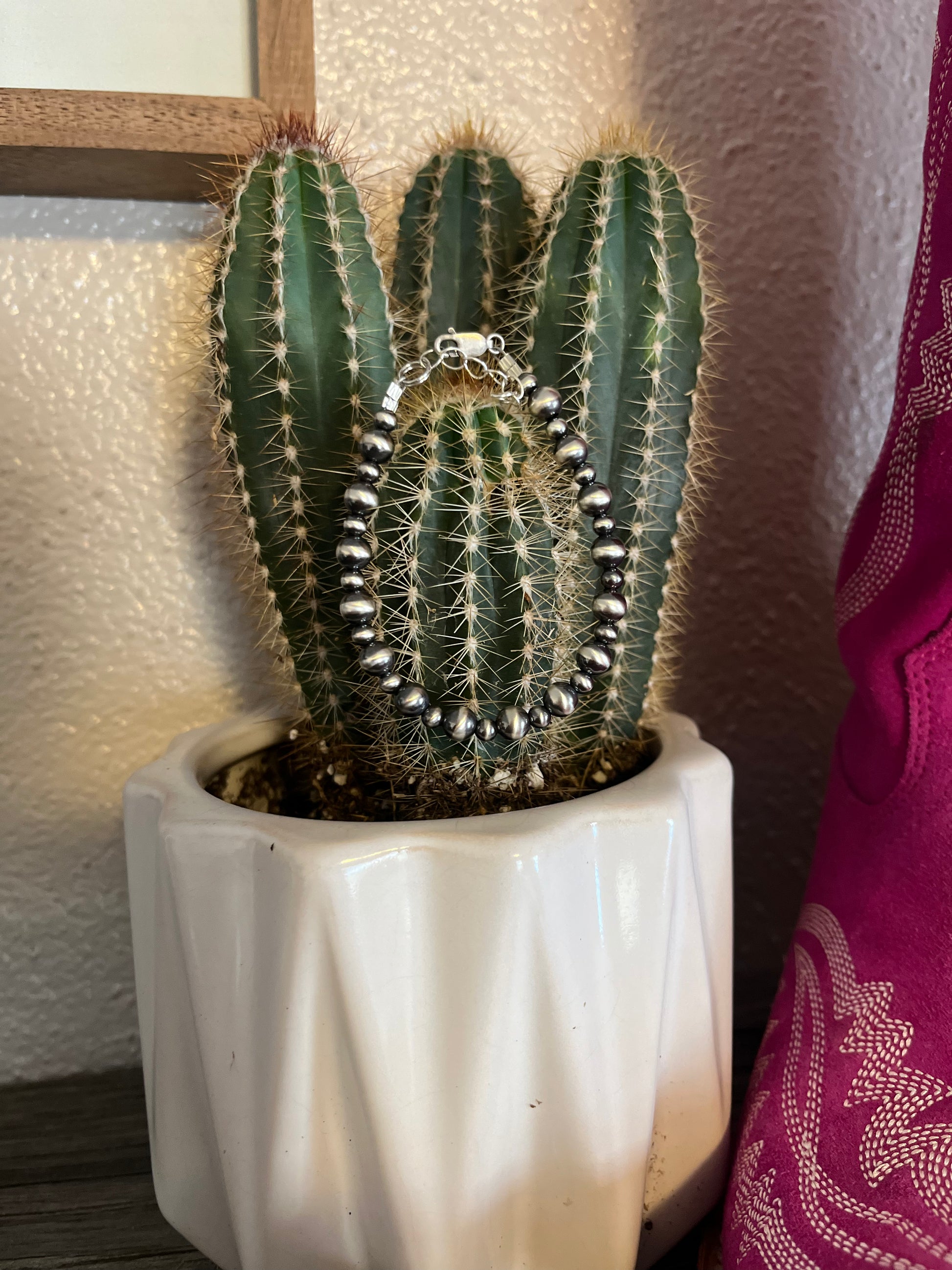 A spin off of our necklace “Bubble Blues” made into a bracelet. “Bubble Blues’ Baby” is still an alternation between 4mm and 6mm. The only difference is that it is 6.5” long with a 1” extender!