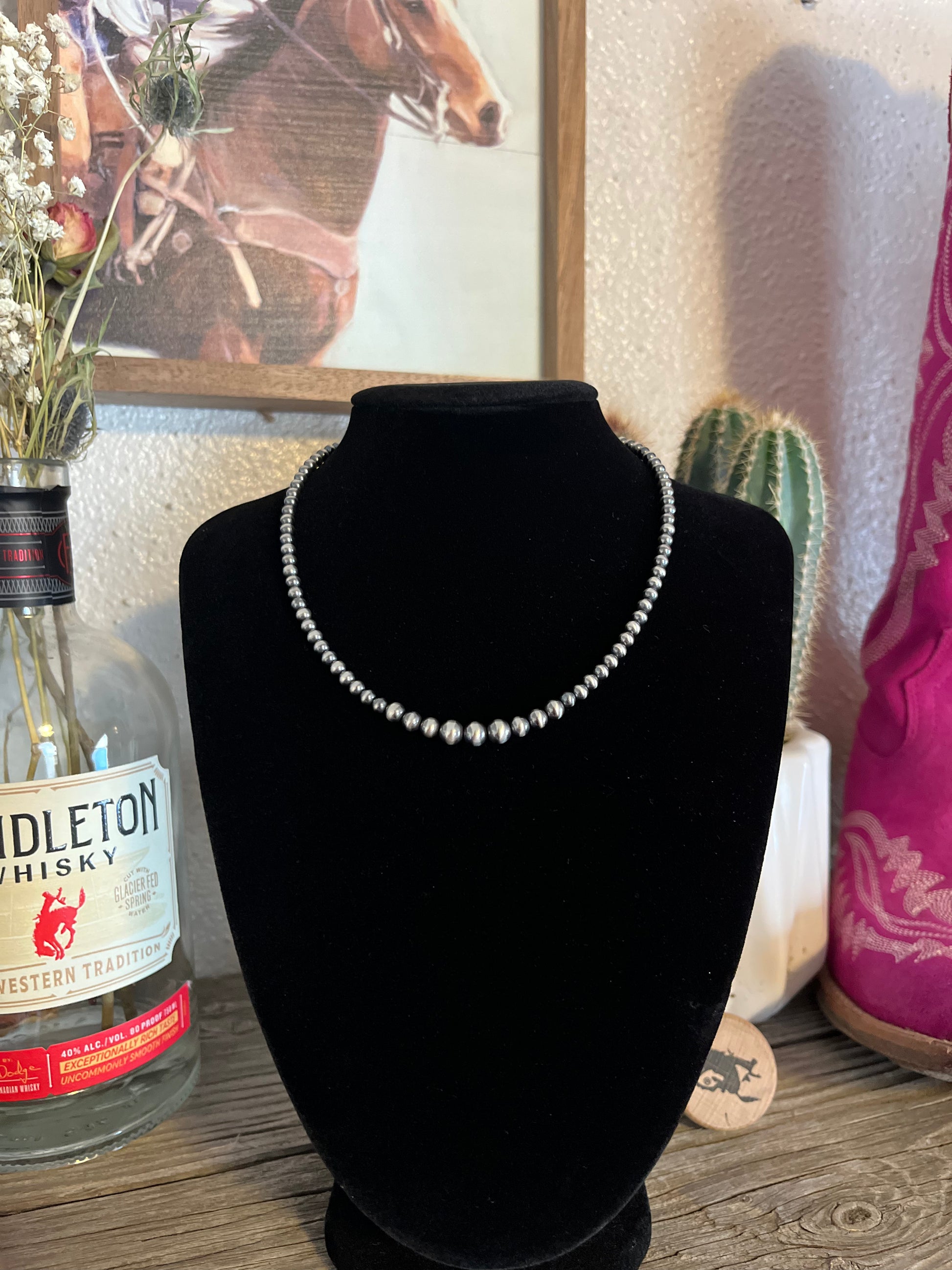 “The Pearl” takes inspiration after the first pearl strand I made by myself! It features 4mm, 5mm and 6mm pearls. It sits at a length of 14.5” with a 3” extender chain.